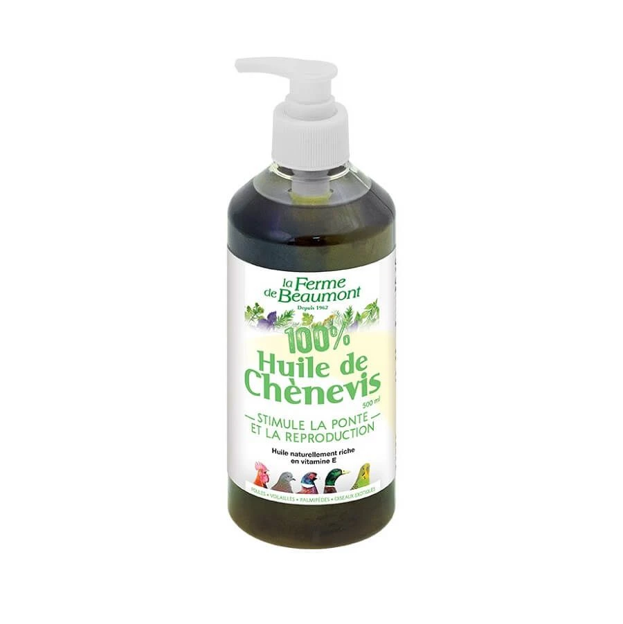L’huile de chènevis de la ferme de Beaumont est une huile 100% naturelle qui contribue à stimuler la ponte et la reproduction des animaux.