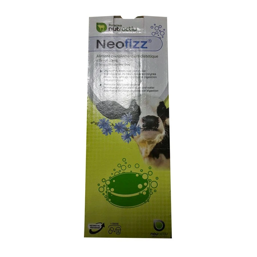 Neofizz est un aliment complémentaire diététique et effervescent ayant comme objectif nutritionnel particulier la stabilisation du bilan des électrolytes et de l’eau afi n de faciliter la digestion physiologique. Neofizz s’utilise sur la base d’un comprimé pour un litre d’eau. Le comprimé doit être dissout dans de l’eau chaude (37°c). Neofizz s’utilise chez le veau, l’agneau, le chevreau, le porcelet et le poulain.