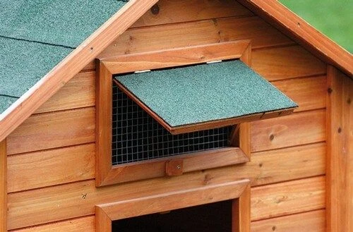Ce poulailler possède une trappe d’aération avec volet, pondoir à 2 compartiments avec accès extérieur, 2 perchoirs.