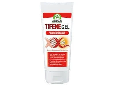 Tifene Gel de chez Audevard est un gel cutané intensif. Contenant 7 huiles essentielles concentrées et de l’acide hyaluronique ce gel va former une barrière protectrice pour la peau (dessèchement..), stimuler la cicatrisation et permettre aux poils de repousser dans la couleur originelle de la robe du cheval.