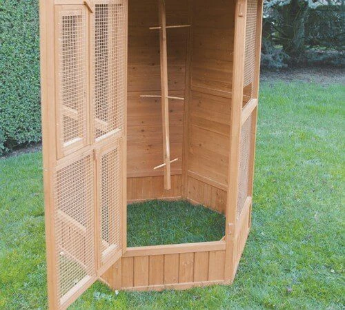 La grande porte de façade comporte 2 petites portes pour pouvoir accéder à la volière sans laisser échapper les oiseaux.
